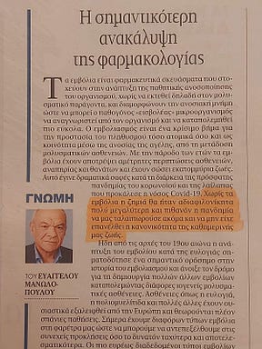 Τον ίδιο ισχυρισμό αναπαράγει και ο Ευάγγελος Μανωλόπουλος, καθηγητής Φαρμακολογίας, Φαρμακογονιδιωματικής και Ιατρικής Ακριβείας του Δ.Π.Θ., πρόεδρος του ΕΟΦ και μέλος της Εθνικής Επιτορπής Δημόσιας Υγείας, στο άρθρο του με τίτλο «Η σημαντικότερη ανακάλυψη της φαρμακολογίας»: