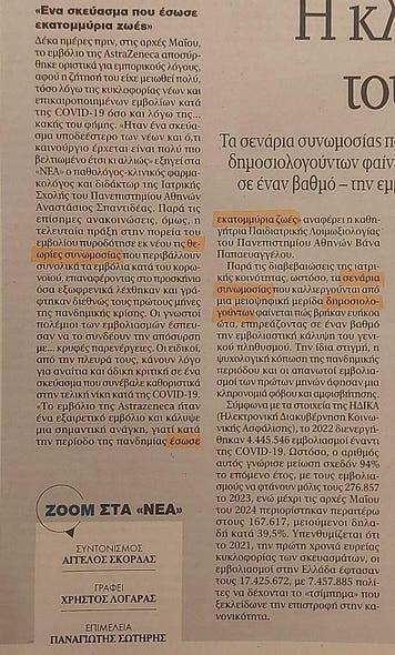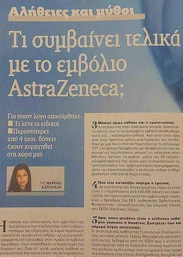 Αυτή ήταν η εξήγηση που κατέγραψε η δημοσιογράφος Μάρθα Καϊτανίδη στο δημοσίευμα της φιλοκυβερνητικής και άκρως νεοταξίτικης εφημερίδας «Τα Νέα» με τίτλο «Αλήθειες και μύθοι. Τι συμβαίνει τελικά με το εμβόλιο AstraZeneca»¹, η οποία συμπλήρωσε ότι η απόσυρση του εμβολίου αυτού: