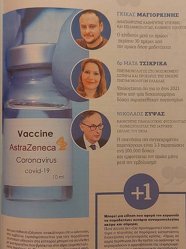 Τέλος, στο ίδιο δημοσίευμα αναφέρεται και η άποψη του Νικολάου Σύψα, καθηγητή παθολογικής φυσιολογίας-λοιμωξιολογίας, ότι οι «τουλάχιστον τρεις θάνατοι» (άραγε, πόσο ευρείας ερμηνείας μπορεί να χρήζει αυτό το «τουλάχιστον»;) που συσχετίσθηκαν με το εμβόλιο της AstraZeneca: