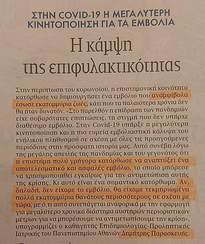 «Χωρίς τα εμβόλια η ζημιά θα ήταν αδιαφιλονίκητα πολύ μεγαλύτερη και πιθανόν η πανδημία να μας ταλαιπωρούσε ακόμα και να μην είχε επανέλθει η κανονικότητα της καθημερινής μας ζωής» (εφημ. «Τα Νέα», 20.5.2024, σελ. 9).