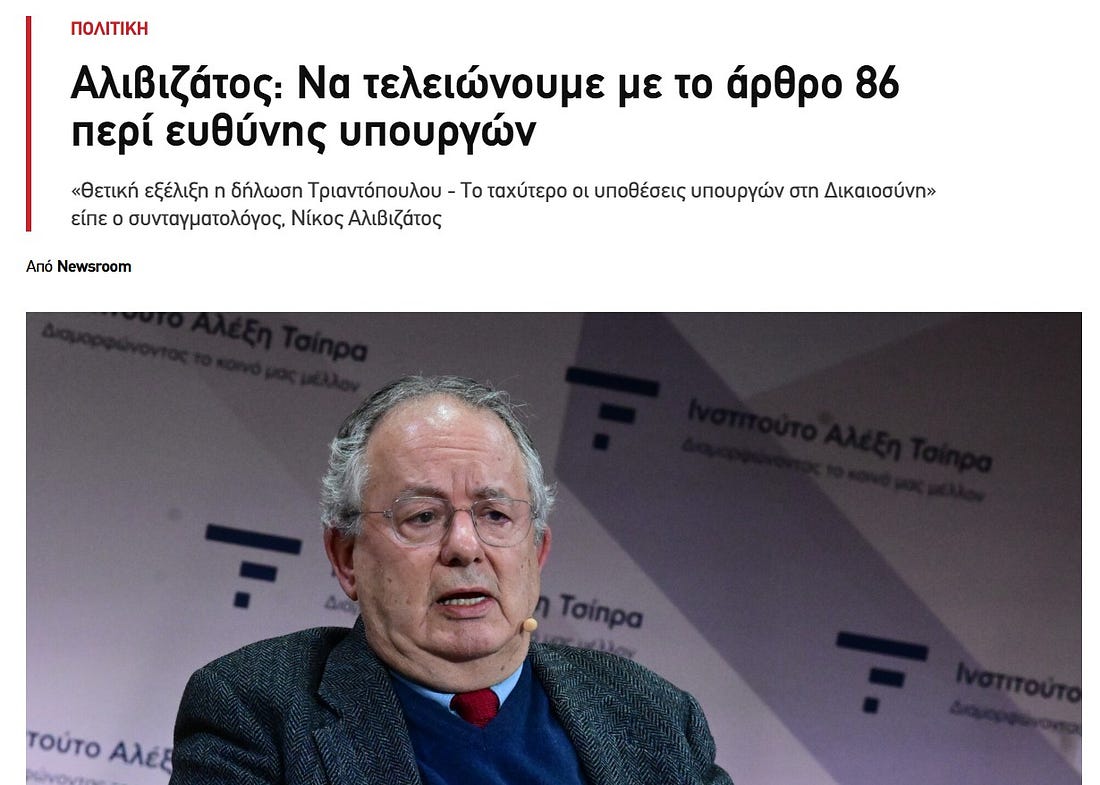 Με αφορμή το αίτημα Τριαντόπουλου, ξανακτύπησε ο συνταγματικός πυλωρός μας Νίκος Αλιβιζάτος, ο πάλαι ποτέ καθηγητής μου στη Νομική Σχολή Αθηνών (1987-1991) και πρότυπο πανεπιστημιακής διδασκαλίας, που, όμως, τα τελευταία χρόνια, όποτε ανοιγκλείνει τα χείλη του, είναι, ως επί το πλείστον, για να θυμιατίσει την κυβέρνηση του λαομπαίκτη Μητσοτάκη, δηλ. την κυβέρνηση της Νέας Δικτατορίας.