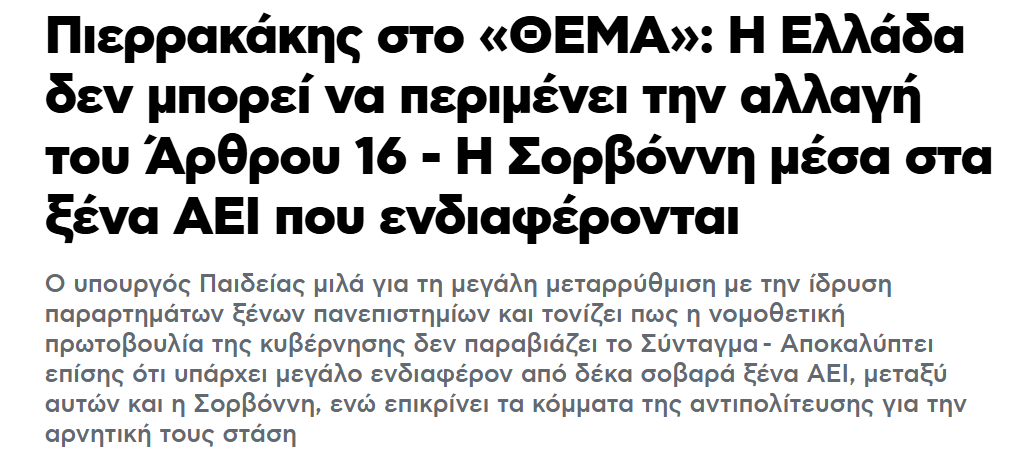 Είναι η ίδια λογική που είχε εφαρμοσθεί και επί συζητήσεως του νομοσχεδίου για τα ιδιωτικά πανεπιστήμια⁸. Παραδεχόμενος, εμμέσως πλην σαφώς, την αντισυνταγματικότητα του νομοσχεδίου, ο τότε Υπουργός Παιδείας Κυρ. Πιερρακάκης είχε δηλώσει ότι η Ελλάδα δεν μπορεί να περιμένει την αλλαγή του άρθρου 16 του Συντάγματος⁹.
