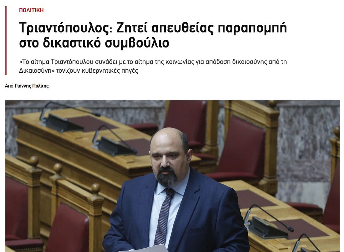 Η συνέχεια στο σίριαλ αυτό δόθηκε αιφνιδιαστικά με την επιστολή Τριαντόπουλου, διά της οποίας ο πρώην υφυπουργός υπέβαλε αίτημα να παραπεμφθεί η υπόθεση απευθείας στον φυσικό δικαστή του, δηλ. στο Δικαστικό Συμβούλιο¹, λες και οι διατάξεις του Συντάγματος είναι ενδοτικού και όχι αναγκαστικού Δικαίου, οπότε ο καθένας μπορεί, κατά το δοκούν, να ζητεί την παράκαμψή του, με το πρόσχημα της αυτοπαράδοσής του σε ένα (τάχα) πιο δίκαιο σύστημα απονομής της Δικαιοσύνης.