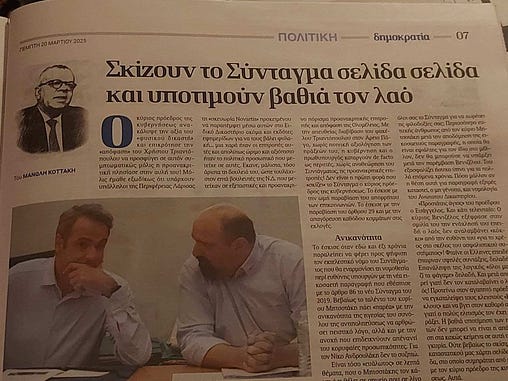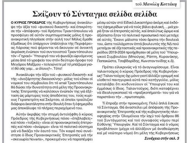 Στην ίδια κατεύθυνση κινήθηκε και ο Διευθυντής της εφημερίδας «ΕΣΤΙΑ» Μανώλης Κοττάκης στο άρθρο του με τίτλο «Σκίζουν το Σύνταγμα σελίδα σελίδα»:¹⁰