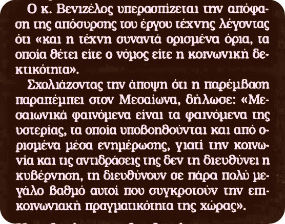 «και η τέχνη συναντά ορισμένα όρια, τα οποία θέτει είτε ο νόμος είτε η κοινωνική δεκτικότητα» (βλ. π.χ. εφημ. «Ελευθεροτυπία», 13.12.2003, σελ. 41).