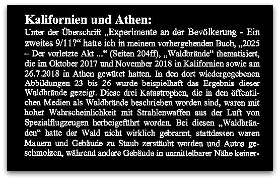 Ακόμη και οι πυρκαϊές στο Μάτι τον Ιούλιο 2018 και στην Καλιφόρνια τον Οκτώβριο 2017 και τον Νοέμβριο 2018, κατά πάσαν πιθανότητα οφείλονται, σύμφωνα με τον συγγραφέα, σε δέσμες ενεργειακής ακτινοβολίας που εκτοξεύθηκαν από αεροσκάφη με ειδικό εξοπλισμό (σελ. 130). Έτσι εξηγείται, μάλλον, και το κοινό φαινόμενο των λιωμένων αυτοκινήτων ή κτηρίων δίπλα σε παντελώς άθικτα αντικείμενα (στο βιβλίο υπάρχει και σχετικό φωτογραφικό υλικό).