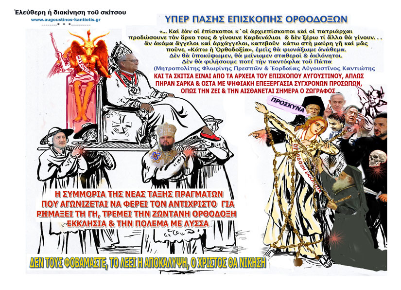 (Ἔχουν το ακαταδίωκτο οι ψευτοκαλλιτέχνες της Νεας τάξης, που παρουσιάζουν ὅτι γεννούν τα σατανικά καὶ αρρωστημένα μυαλά τους καὶ ἂς εἶναι βλάσφημα, ἐμμετικά καὶ ἀποκρουστικά. Ἔ, λοιπόν, θὰ χρησιμοποιοῦμε καὶ ἐμεῖς τὸ ἴδιο μέσον, μὲ ζωντανές παραστάσεις, χωρίς πολλά λόγια, μὲ σκίτσα ἀπό τὰ ἀρχεια τοῦ ἀγωνιστοῦ ἱεράρχου π. Αὐγουστίνου Καντιώτου. Καὶ σαν πραγματικοί καλλιτέχνες, τὰ δίνουμε σαρκα καὶ οστά, μὲ ψηφιακὴ ἐπεξεργασία, τοποθετωντας σ᾽αὐτά πρόσωπα, ρασοφόρα και μη, ποὺ ἄλλαξαν στρατόπεδο, εισπήδησαν στὸ στρατόπεδο τῶν σκοτεινῶν δυνάμεων καὶ δουλευουν γιὰ νὰ ἀλλοιώσουν τὴν Πίστη τῶν Ὀρθοδόξων).