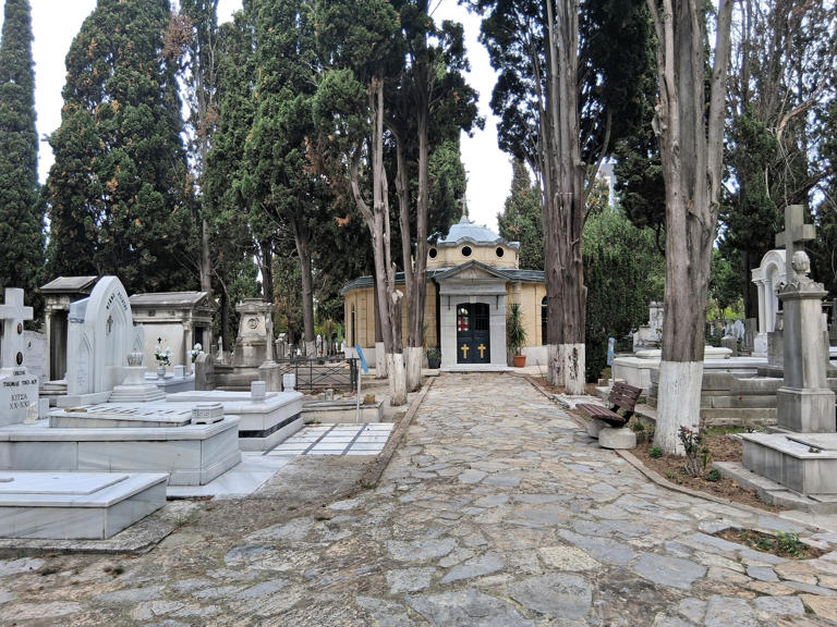 Μόλις περνώ την επιβλητική πύλη του κοιμητηρίου, στην οποία δεσπόζει η μεγάλη επιγραφή «ΝΕΚΡΟΤΑΦΕΙΟΝ ΤΗΣ ΡΩΜ(ΑΙΙΚΗΣ) ΟΡΘΟΔΟΞΟΥ ΚΟΙΝΟΤΗΤΟΣ», με υποδέχεται ο πατέρας Φώτιος. Ιερουργεί εκεί κάθε Σάββατο και είναι υπεύθυνος για τη φροντίδα και τη διατήρηση αυτού του ιερού τόπου. Μια ήρεμη και φωτεινή παρουσία, σχεδόν καθησυχαστική. Από τα πρώτα του λόγια καταλαβαίνεις πως πρόκειται για έναν άνθρωπο που γνωρίζει και αφηγείται την πολύτιμη ιστορία του τόπου αυτού με σεβασμό και αγάπη. Όπως μου εξηγεί, οι ταφικές στήλες και οι προτομές που απλώνονται τριγύρω δεν είναι απλώς μνήματα. Είναι έργα τέχνης, μαρτυρίες μιας εποχής κατά τη διάρκεια της οποίας, όπως τονίζει, πολλές φορές ακόμη και ο θάνατος εκφραζόταν με αισθητική και ευγένεια.